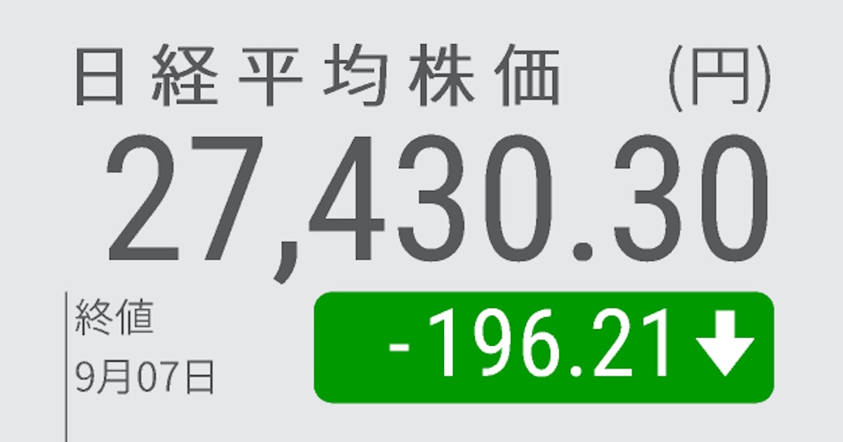 7日の東京株式市場で日経平均株価は反落し、前日比196円21銭(0.71%)安の2万7430円30銭で終えた。7月19日以来およそ1カ月半ぶりの安値水準。米国の積極的な金融引き締めが改めて意識され、運用リスクを回避する売りが優勢だった。週末に特別清算指数(SQ)算出を控えた思惑的な売りも出て、下げ幅は一時350円を超え...