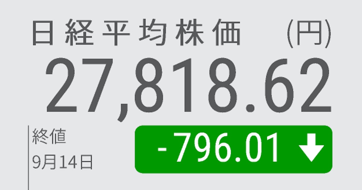 14日の東京株式市場で日経平均株価は5営業日ぶりに大幅反落し、前日比796円01銭(2.78%)安の2万7818円62銭で終えた。日経平均の下げ幅は6月13日(836円安)以来の大きさだった。米国の利上げが加速するとの警戒から、13日の米株式相場が急落。投資家心理が悪化し、東京市場でも幅広い銘柄への売りが強まった。13...