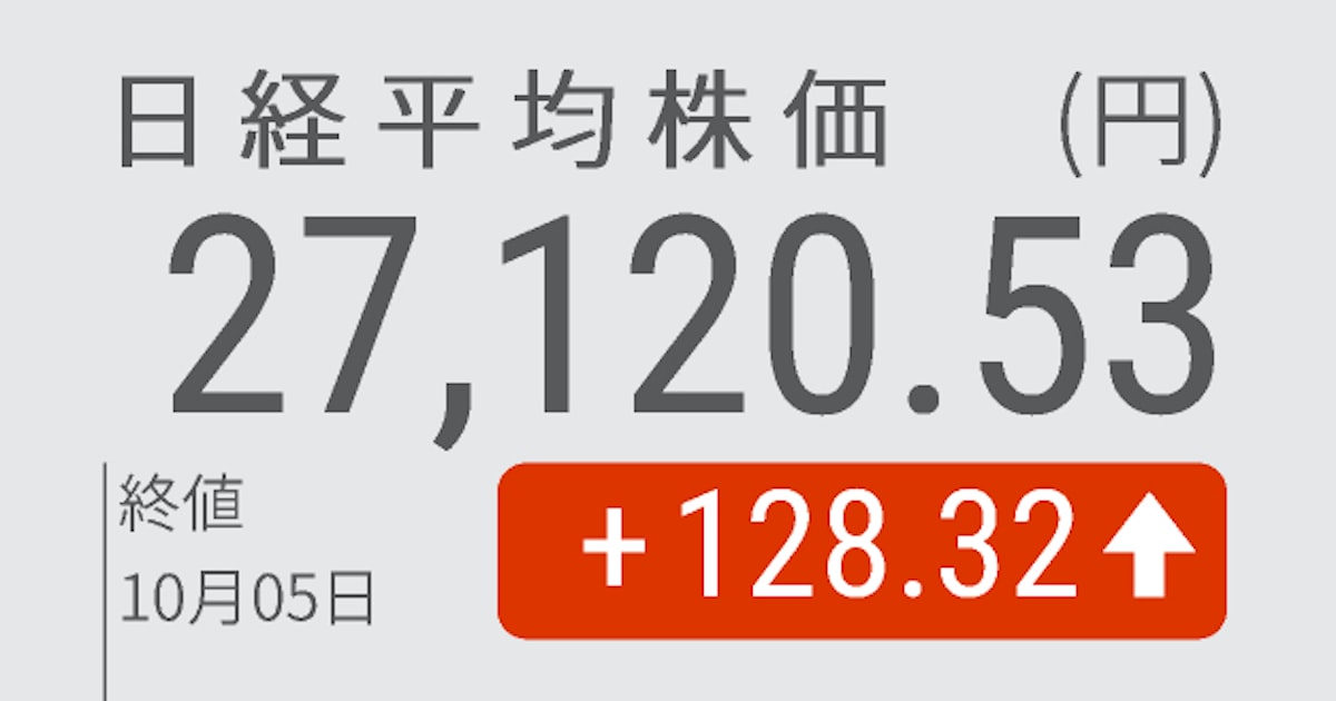 5日の東京株式市場で日経平均株価は3日続伸し、前日比128円32銭(0.48%)高の2万7120円53銭で終えた。終値で節目の2万7000円を回復するのは9月22日(2万7153円)以来およそ2週間ぶり。前日の米株高を受けて投資家心理が改善した。東京市場でも運用リスクを取る動きから買いが優勢だった。半面、直近で相場水準...