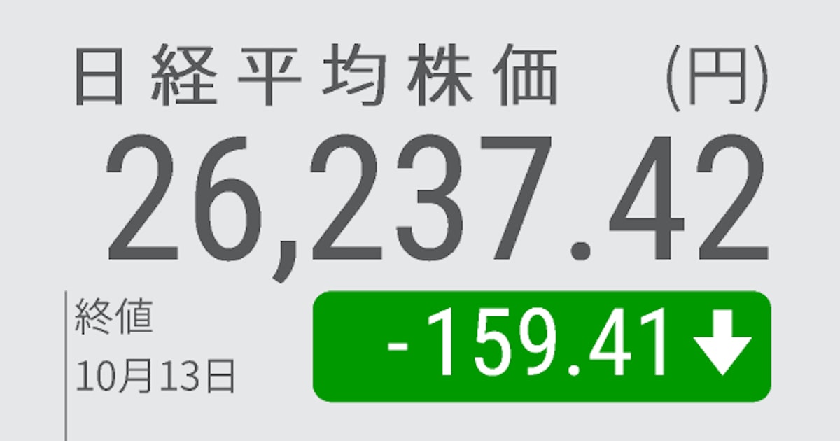 13日の東京株式市場で日経平均株価は4日続落し、前日比159円41銭(0.6%)安の2万6237円42銭で終えた。米国の金融引き締め強化による世界景気の悪化を懸念し、幅広い銘柄に売りが出た。足元で堅調だったリオープン(経済再開)関連への売りも目立った。9月の米消費者物価指数(CPI)の発表を日本時間夜に控え、午後は様子...