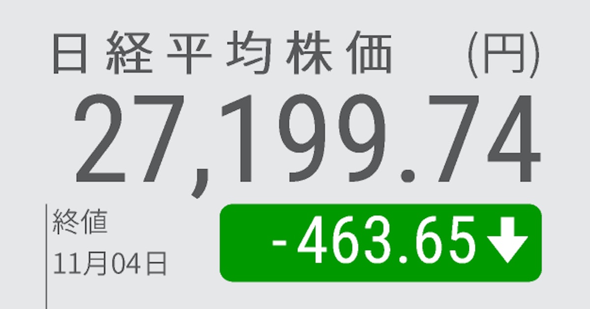 日経平均続落、終値463円安の2万7199円 - 日本経済新聞