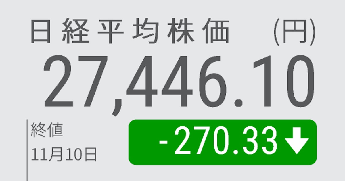 10日の東京株式市場で日経平均株価は続落し、前日に比べ270円33銭(0.98%)安の2万7446円10銭で終えた。米中間選挙が予想外の接戦となり、政治・経済の先行き不透明感から前日の米株が下げた流れを受け、売りが優勢になった。日本時間10日夜に10月の米消費者物価指数(CPI)の発表を控え、午後の相場は動きが鈍かった...