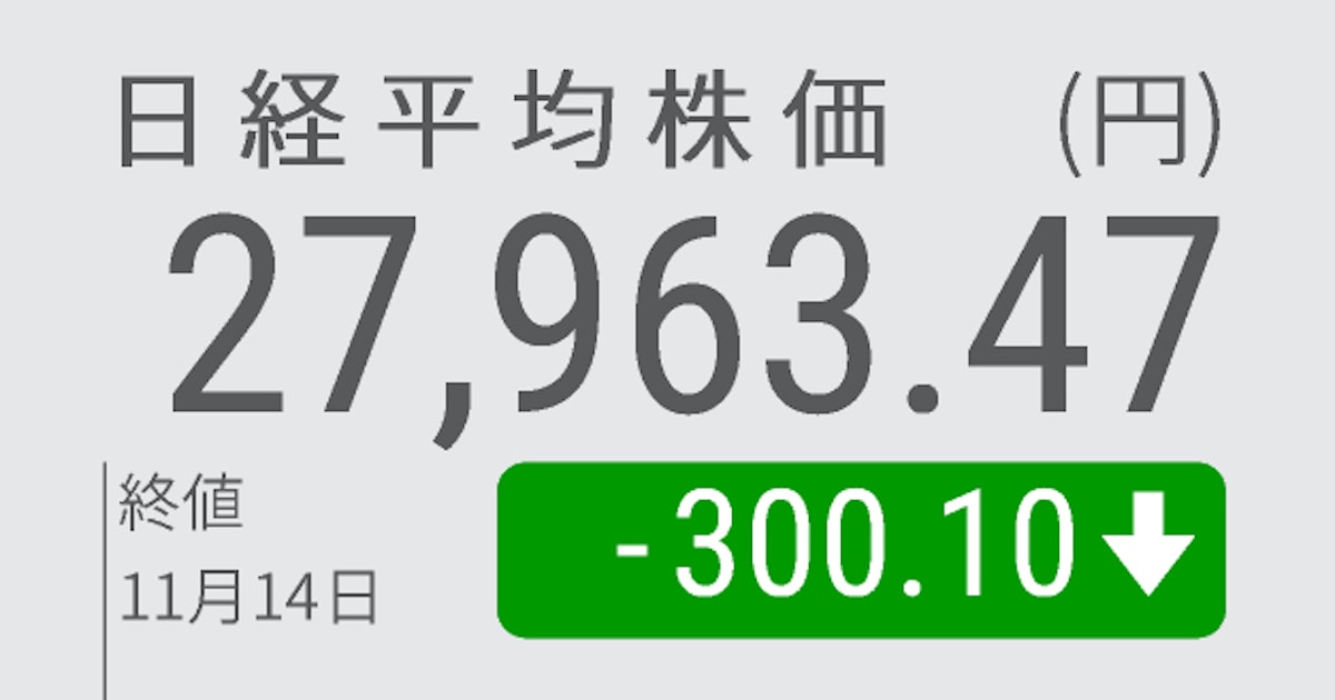 日経平均反落、終値300円安の2万7963円 - 日本経済新聞