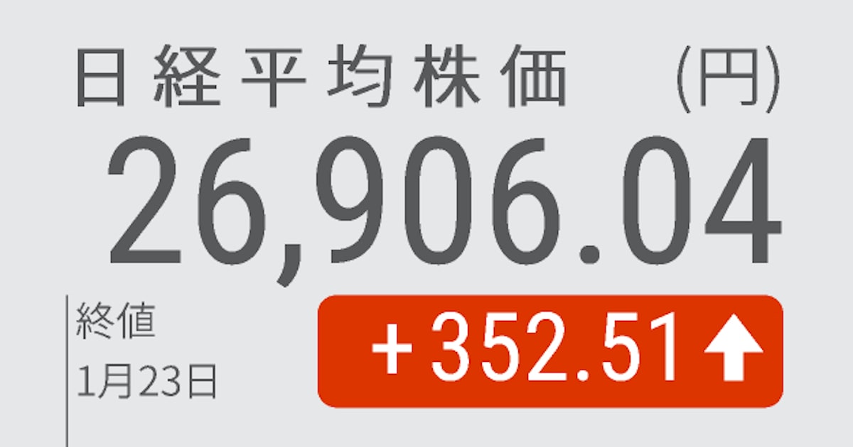 23日の東京株式市場で日経平均株価は続伸し、大引けは前週末比352円51銭(1.33%)高の2万6906円04銭だった。2022年12月19日以来、約1カ月ぶりの高い水準を付けた。前週末の米ハイテク株急伸や円安・ドル高を支えにした買いが優勢だった。指数への影響度が高い値がさ株や半導体関連株が軒並み上昇した。取引終盤にか...