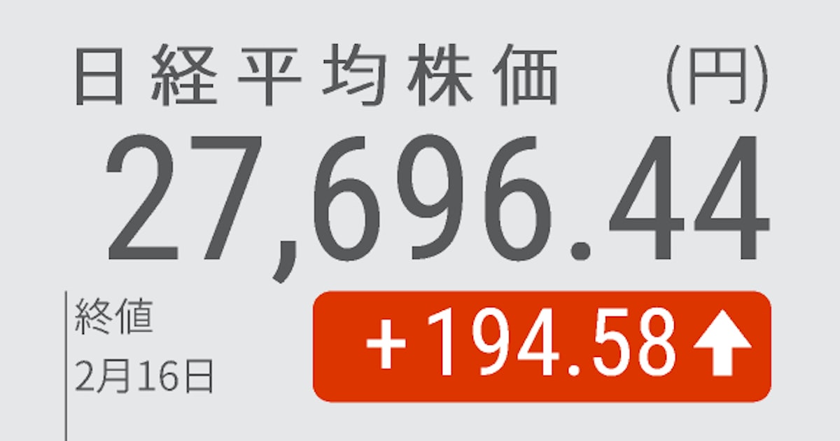 16日の東京株式市場で日経平均株価は反発し、大引けは前日比194円58銭(0.71%)高の2万7696円44銭だった。2022年12月15日以来、およそ2カ月ぶりの高値水準を付けた。前日の米株式相場の上昇や外国為替市場での円安進行を受けて投資家心理が上向き、幅広い銘柄に買いが入った。東証株価指数(TOPIX)は反発し、...