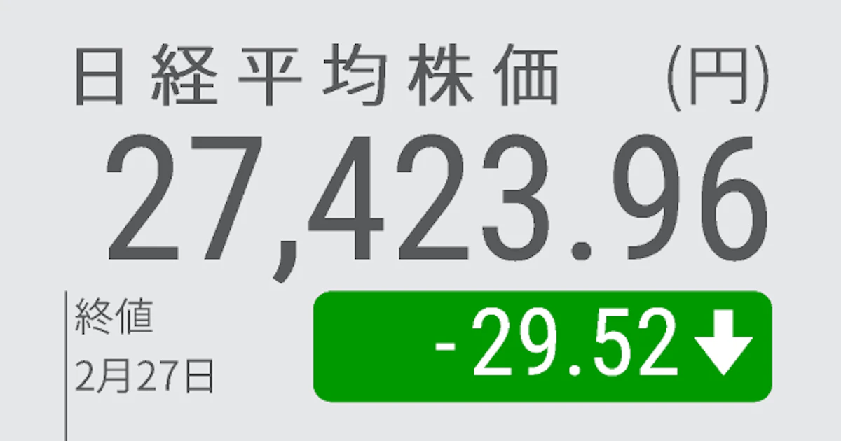 日経平均反落、終値29円安の2万7423円 - 日本経済新聞